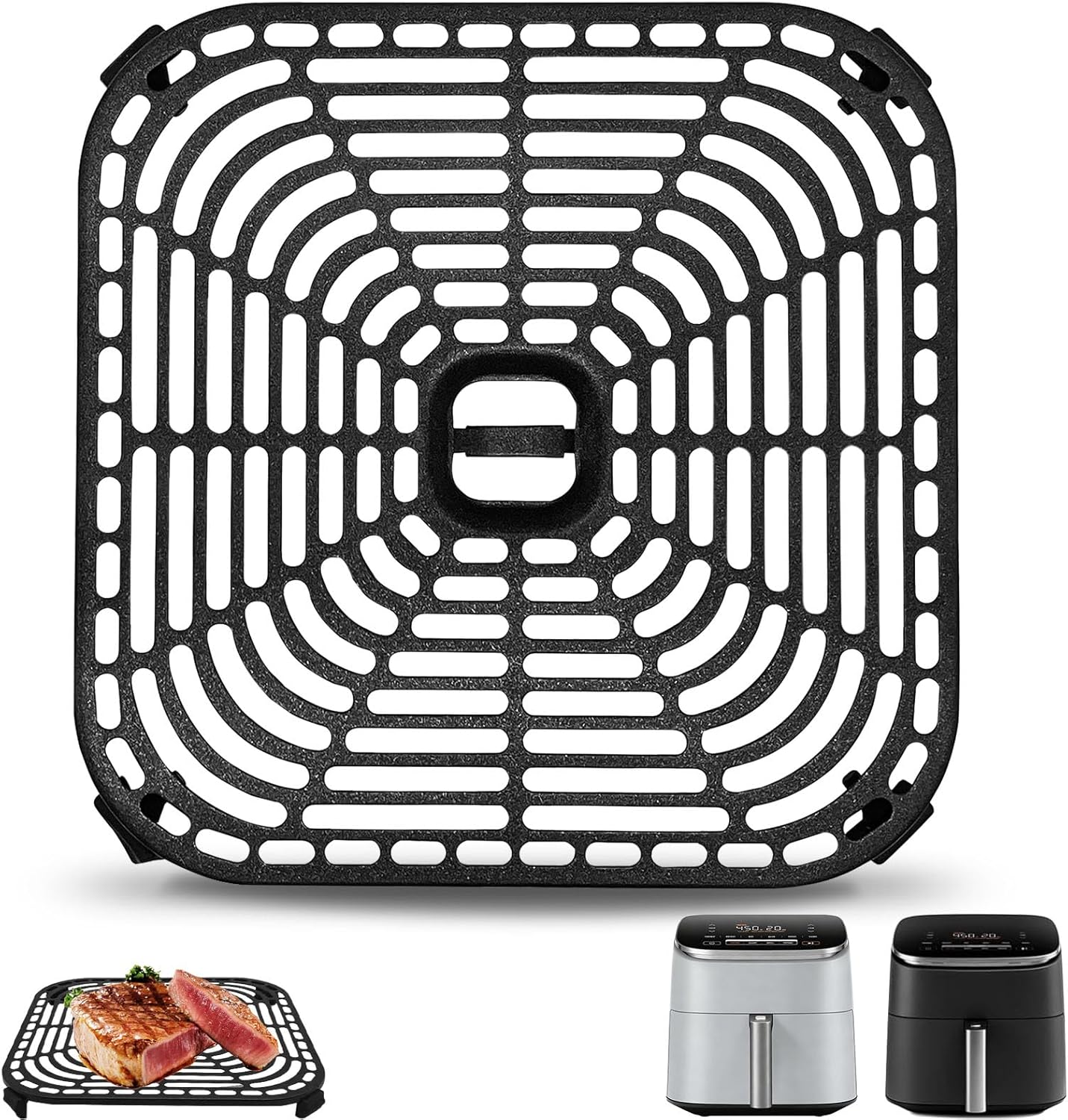 - Package Include: 1× Air Fryer Grill Plate, 1× Magic cleaning cloth, 4× Air Fryer Rubber Bumpers. Note: Please measure the size of your air fryer before placing an order