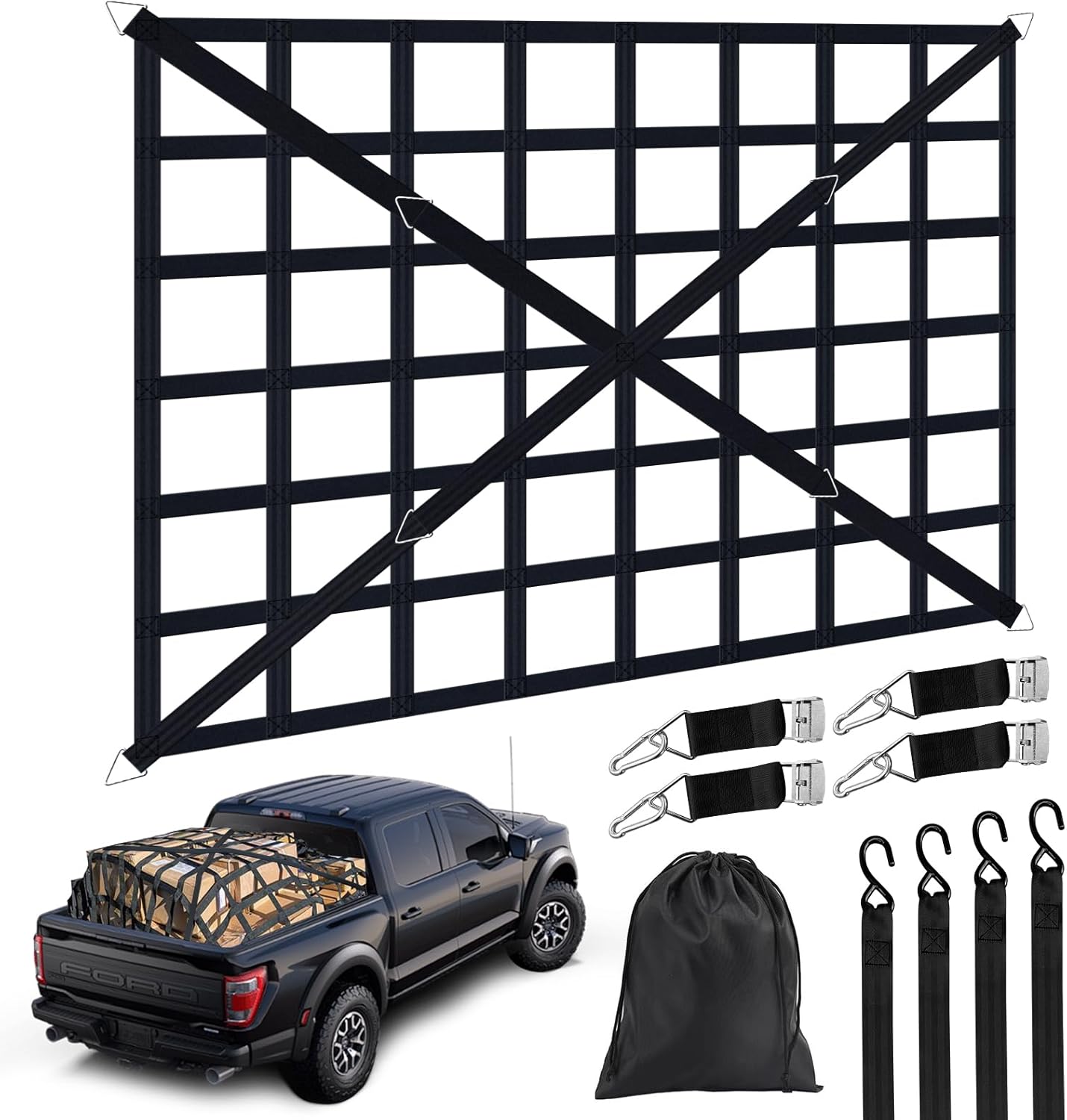 - Convenient Storage: Comes with a drawstring storage bag, making it easy to store the cargo net after use, preventing unnecessary space occupation and keeping your truck bed tidy and organized.