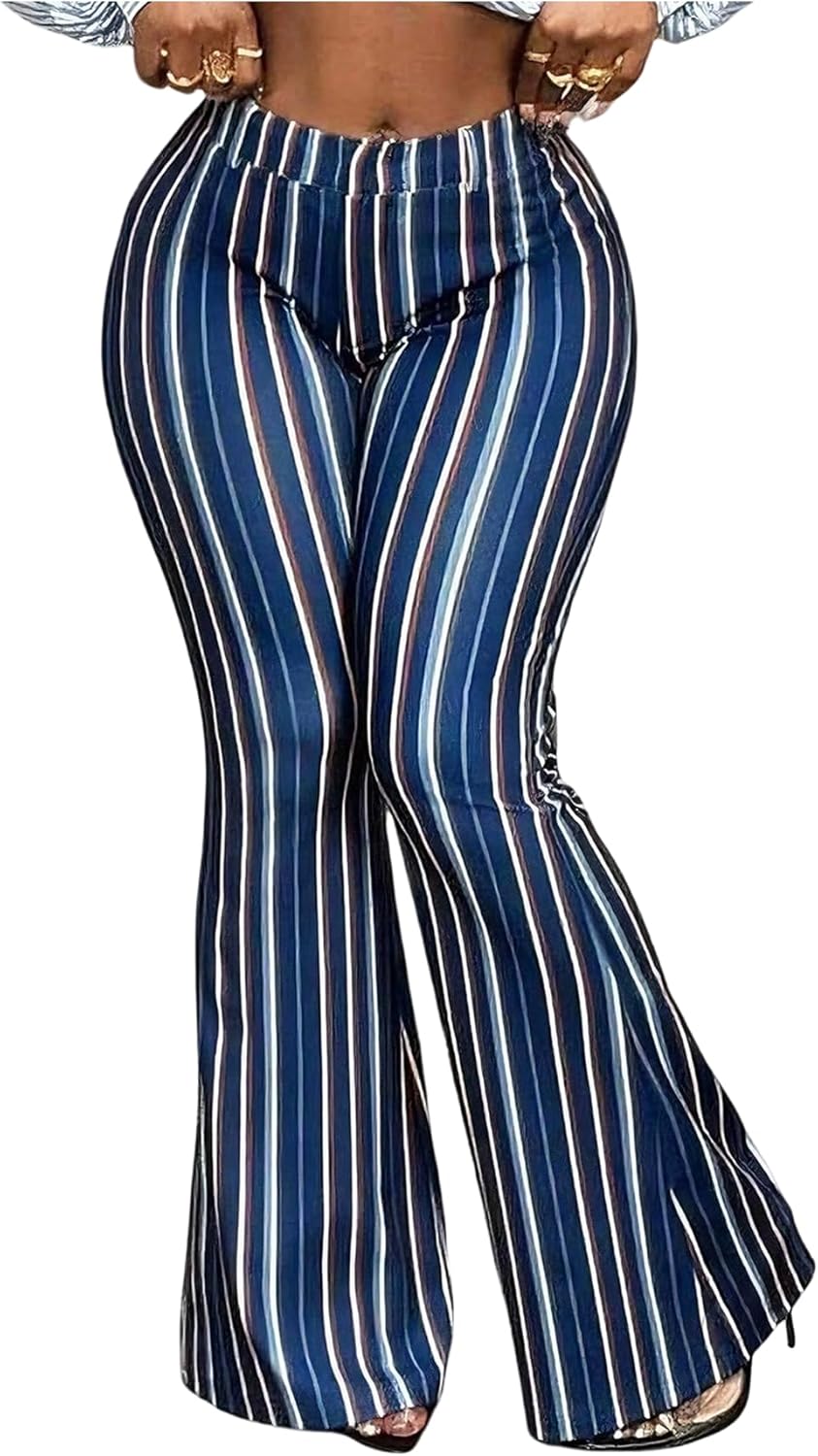 WDIRARA Women's Plus Size Striped Flare Pants Elastic Waist Bell Bottom Pants