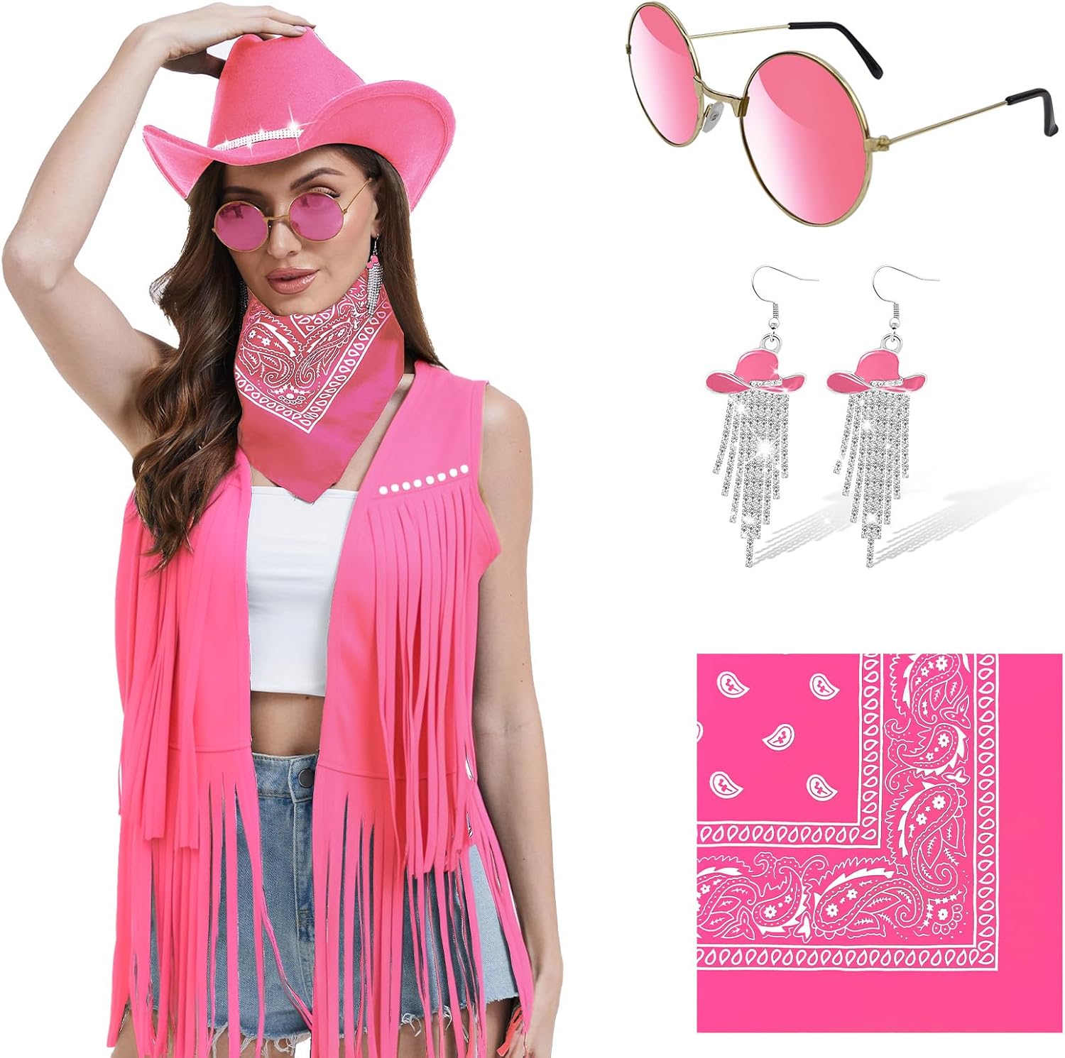 FunMular Western Outfit for Women Cowgirl Outfit Costume Accessories Cowboy Hat Fringe Vest Earring Bandana for Halloween