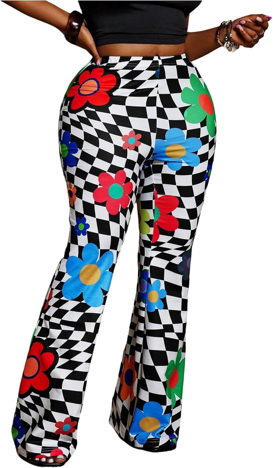 WDIRARA Women's Plus Size Floral Checkered Flare Pants Elastic Waist Bootcut Pants