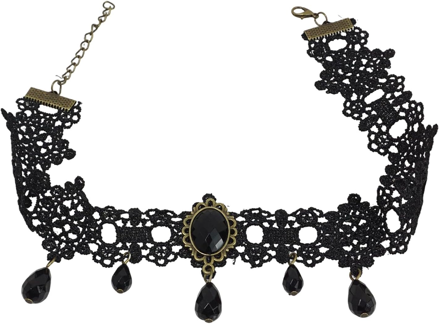 Gothic Choker Necklace, Black Lace Choker with Crystal Pendant for Women, Witch Style Adjustable Collar Gothic Halloween and Vampire Themed Vintage Thick Neck Jewelry Accessories