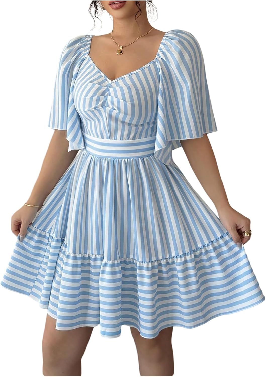 Floerns Women's Summer Flutter Sleeve A Line Dress Ruched Bust Striped Vacation Tiered Dresses