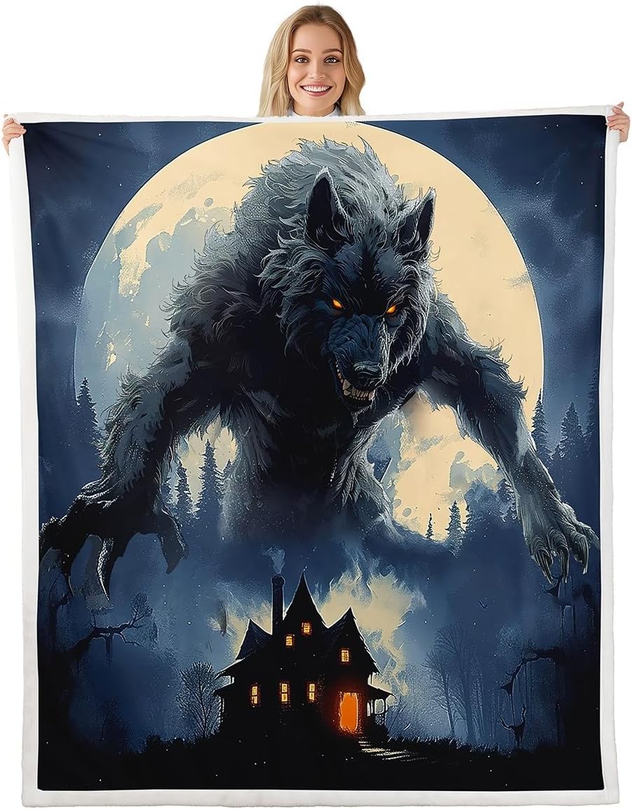 Howling Wolf Throw Blanket,Gothic Castle Blankets Kids Boys Teens Men Room Decor,Western Moon Night Werewolf Theme Fleece Blanket Horror Wild Animals Sherpa Blanket,for Chair/Sofa,50"×60"