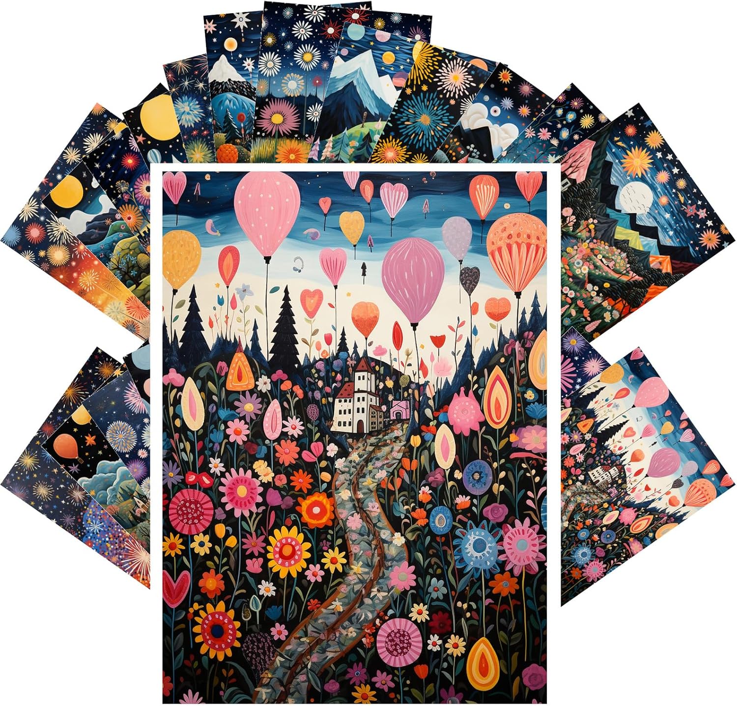 PIXILUV Vintage Postcards (24pcs 4"x6") Vibrant Vistas: A Whimsical Journey Through Blossoming Landscapes and Starry Nights - A Postcard Set Infused with Magic and Color