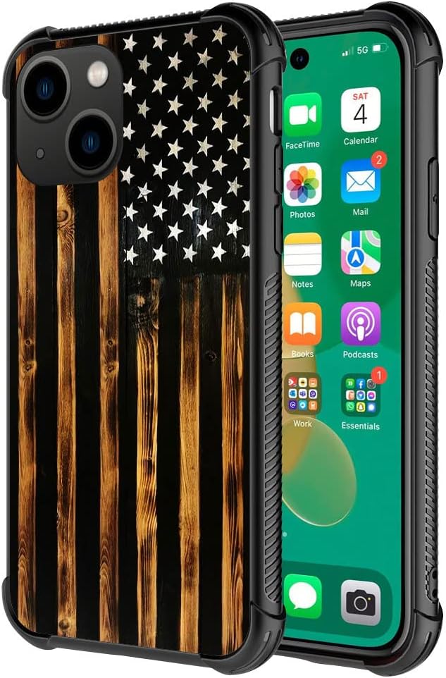 DJSOK Case for iPhone 14,Luxury Pattern Design Shockproof Rugged Cover,Cases for Man Woman-Classic Wood Grain Old Flag