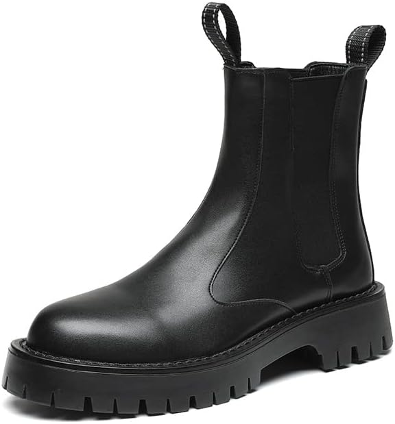 Men's Leather Platform Chelsea Boots Lug Sole Chunky Heel Brogue Dress Ankle Boots Round Toe Retro Slip-On Oxfords Boot