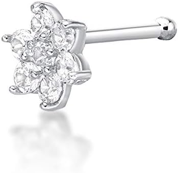 Lavari Jewelers 22 Gauge Straight Bone Flower Nose Stud for Women or Men - 14k White or Yellow Gold 4.5mm Cubic Zirconia Nose Ring - Unisex Hypoallergenic Nostril Piercing Jewelry - 22G Body Piercing