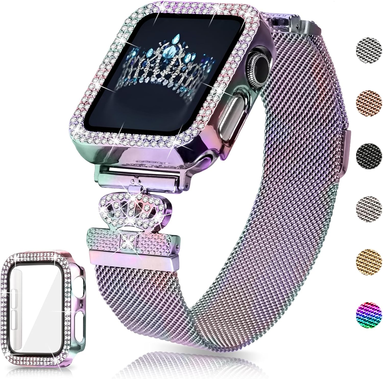 Magnetic Band Compatible with Apple Watch 38mm 40mm 41mm 42mm 44mm 45mm 46mm Stainless Steel Metal Strap with Bling Case and Built-in Screen Protector, Dressy Milanese Loop iWatch Bands for Women