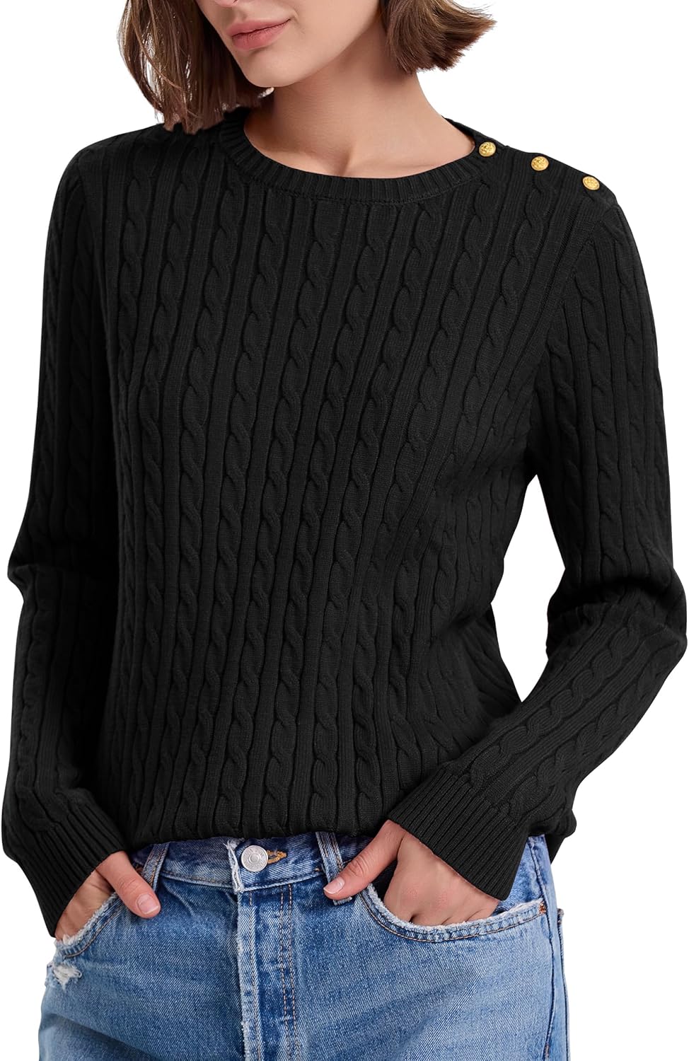 PrettyGuide Women's Cable Knit Sweater Long Sleeve Crewneck Button Shoulder Casual Pullover Sweaters Tops