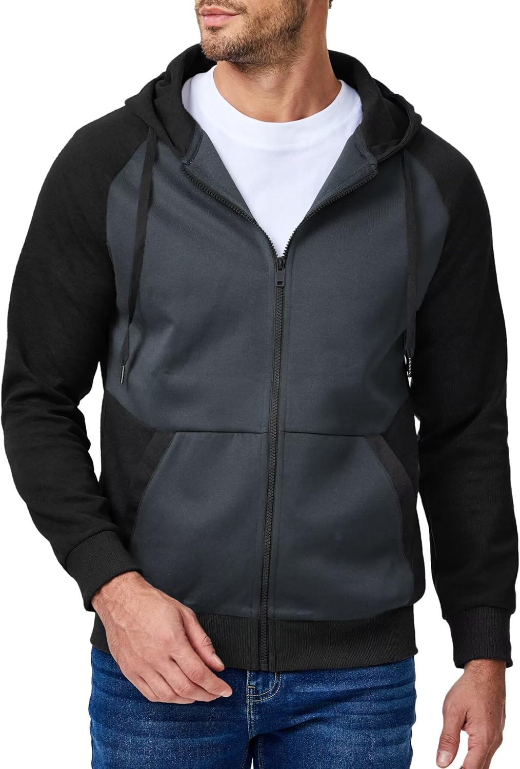 Men's Full-Zip Hoodies Sweatshirts Color Block Long Sleeve Casual Pullover Shirt with Kanga Pocket