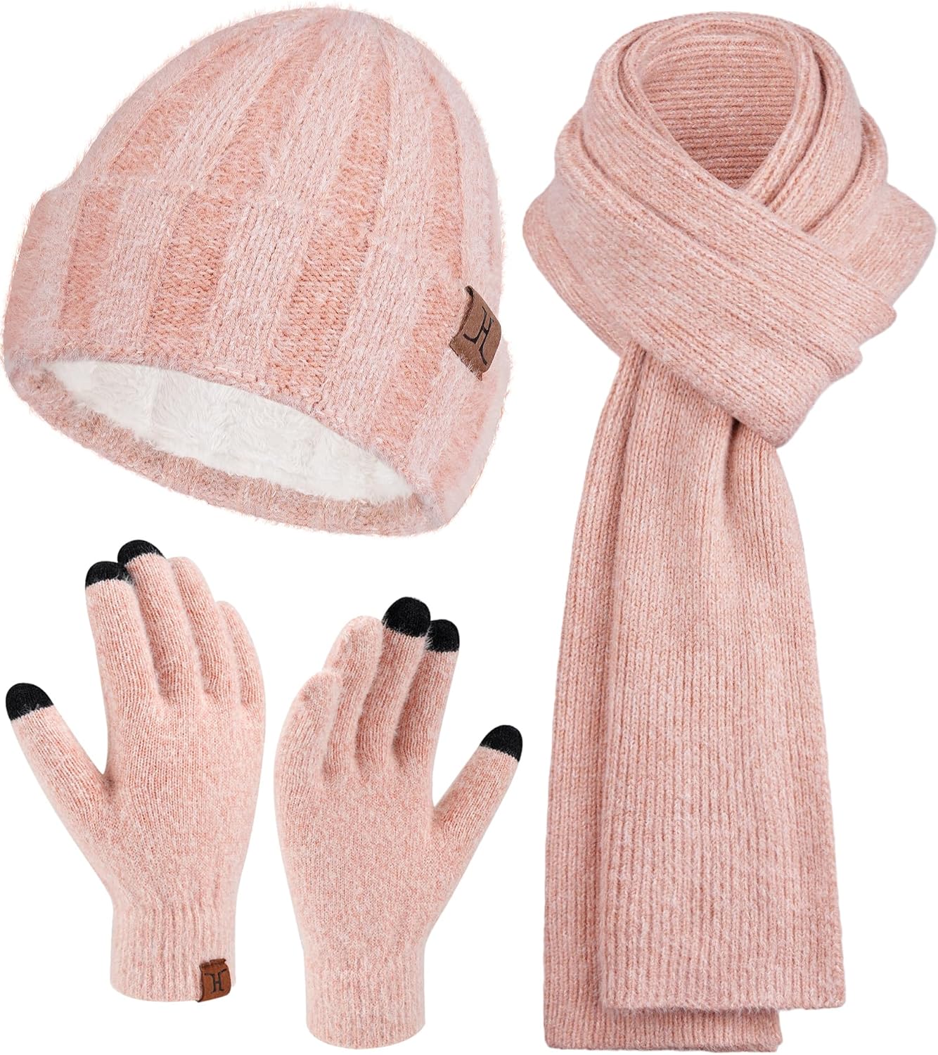 Womens Winter Warm Knit Beanie Hat Touchscreen Gloves Long Neck Scarf Set with Fleece Lined Skull Caps Gifts for Women