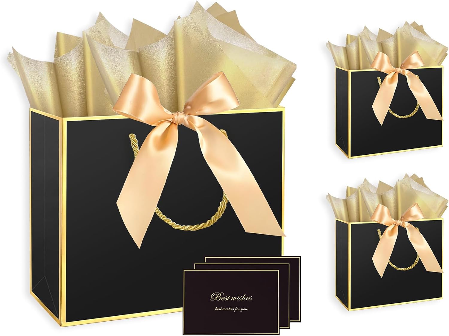 Gift Bags 3 Pcs Large Size Gift Bags with Tissue Paper and Handles,Bow Ribbon and Greeting Cards, 11.8" x 4" x 10", Black