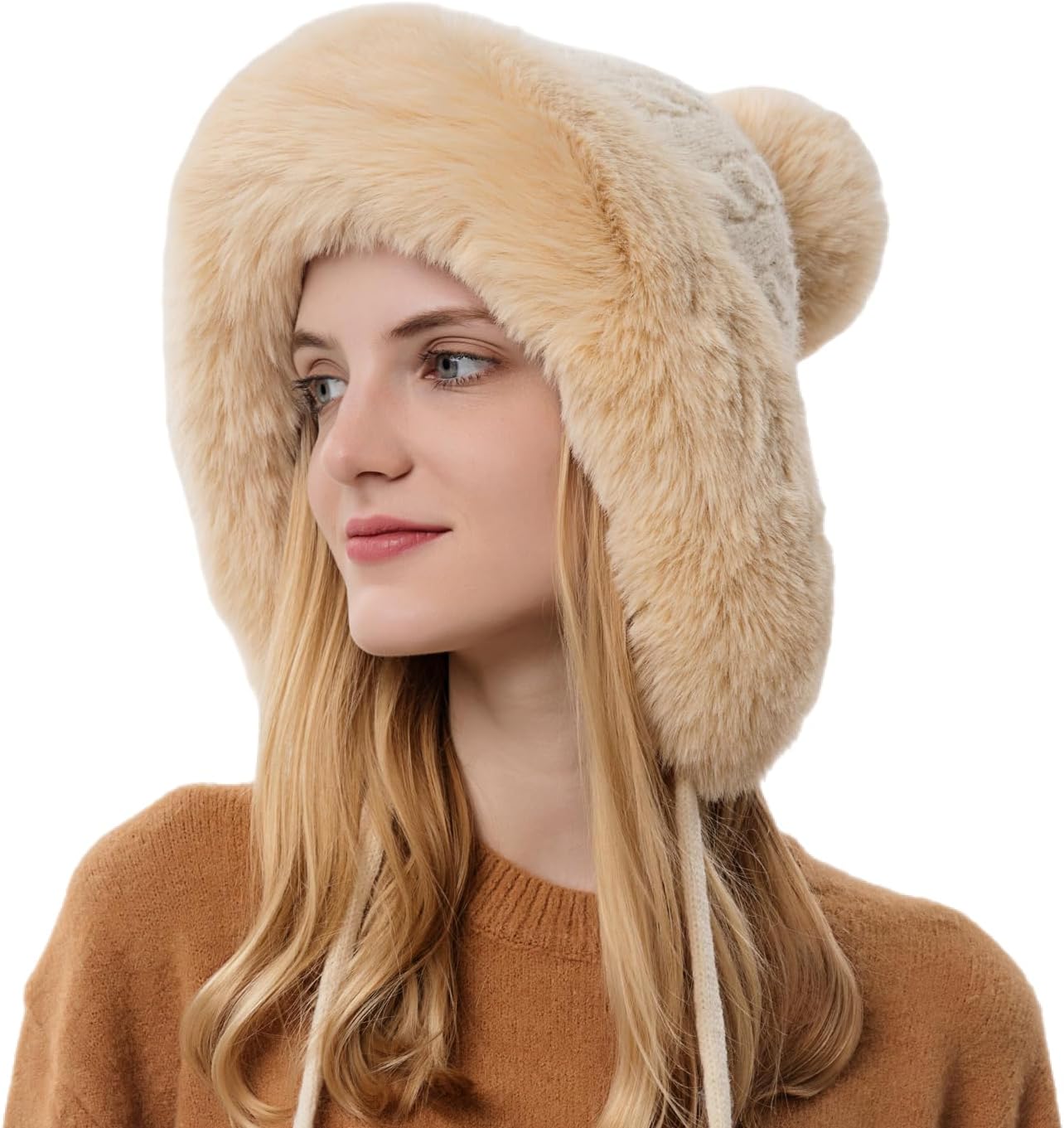 Women Winter Peruvian Cover Ears Beanie Hat Ear Flaps Sherpa Ski Snow Hats Knit Fleece Lined 3 Pom Pom