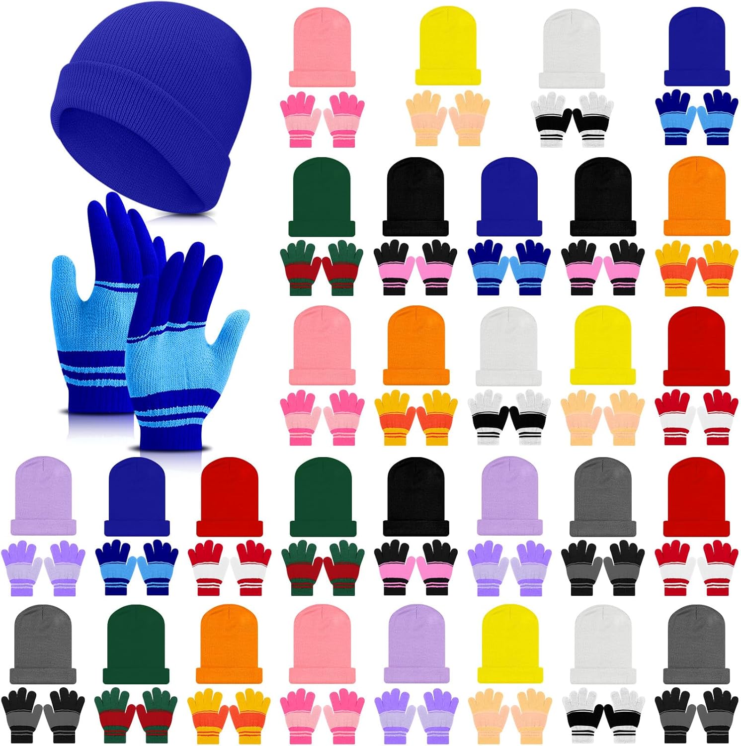 Handepo 60Pcs Kids Winter Beanie and Gloves Bulk Knit Hats Gloves Warm Unisex Cold Weather Winter Gifts for Boy Girl Homeless