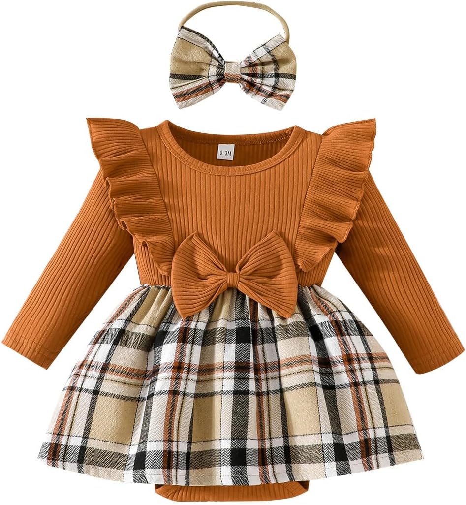 Magic Park 0-24M Baby Toddler Girls Ruffle Long Sleeve Bodysuit Ribbed Plaid Romper Dress Fall Winter Outfit with Headband