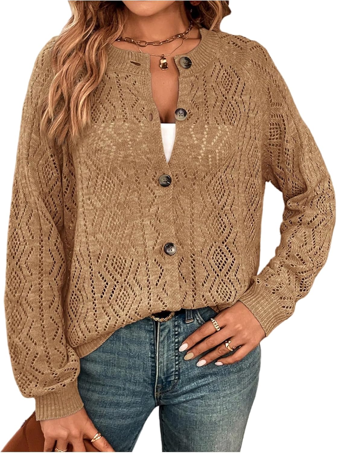 GORGLITTER Women's Crochet Cardigan Cozy Long Sleeve Button Up Lightweight Crew Neck Knit Sweaters Going Out Outfits