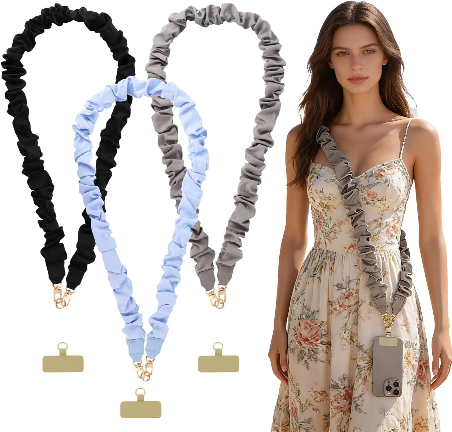3 Pcs Phone Lanyard Crossbody, Stretchy Scrunchie Phone Strap, Anti-Lost Neck Strap with Metal Patch for ID Cards, Keys, Versatile Accessory for Women, Men (Black,Blue,Gray)