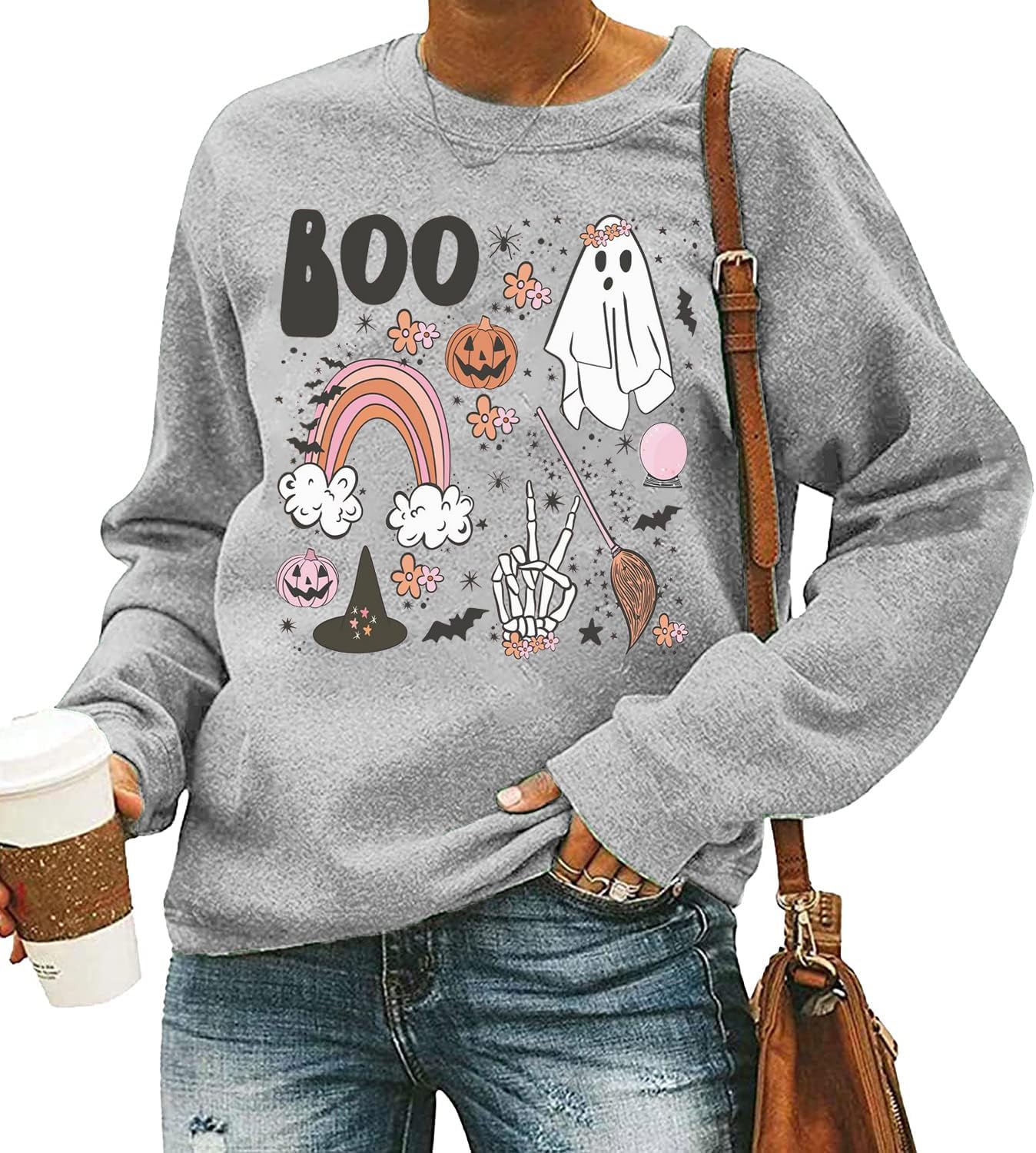 Halloween Ghost Sweatshirt Women Cute Vintage Graphic Spooky Season Tshirt Casual Loose Long Sleeve Pullover Tops
