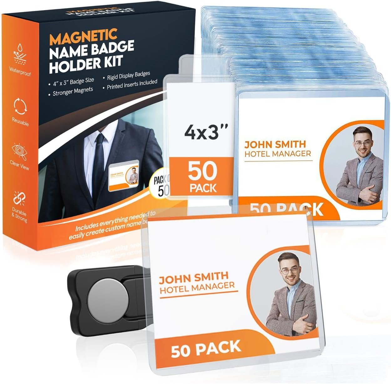 - 【Great Value】This magnetic name badge all-in-one kit contains everything you need for a hundred people with 50 pcs of 4"x3" inch horizontal badge holders with magnets already attached & white printable inserts. Keeps badges secure, clean, and prominently displayed perfect for conventions, exhibitors and other events.