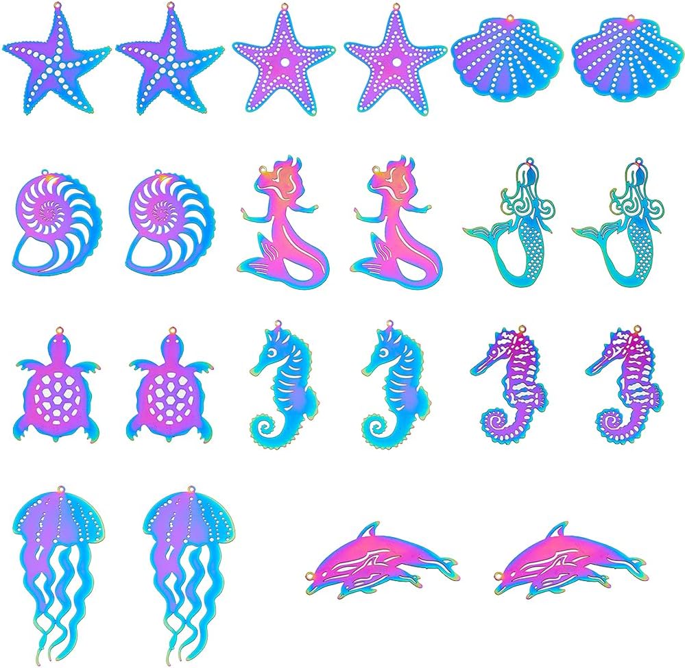 22pcs Stainless Steel Sea Animals Charm 11 styles Metal Embellishments Ocean Theme Pendants Rainbow Hollow Sea Animal Pendants for Necklace Earrings Jewelry Making DIY Crafts