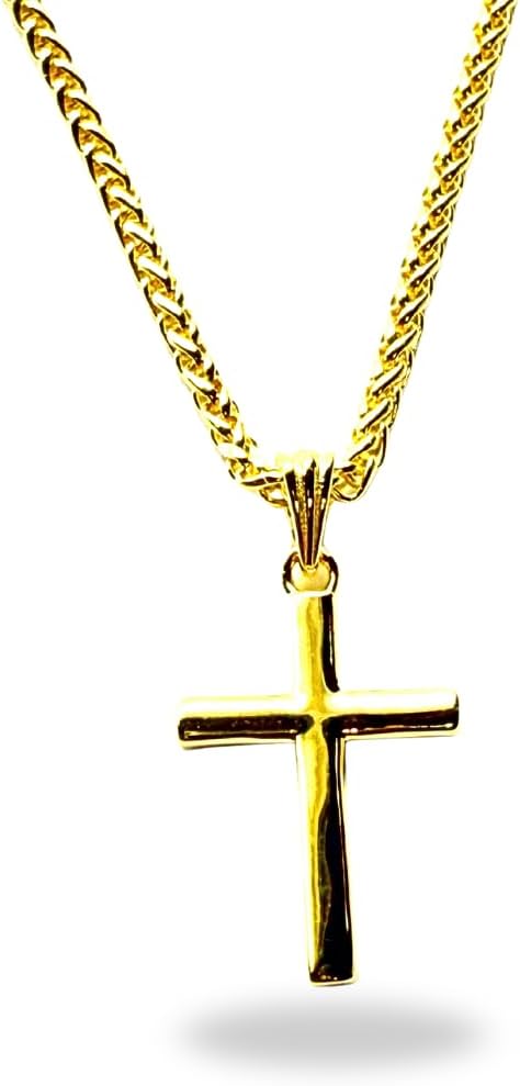 14K Solid Gold Small Cross Pendant Necklace with 2mm Wheat Chain for Men, Women, and Teens (20")