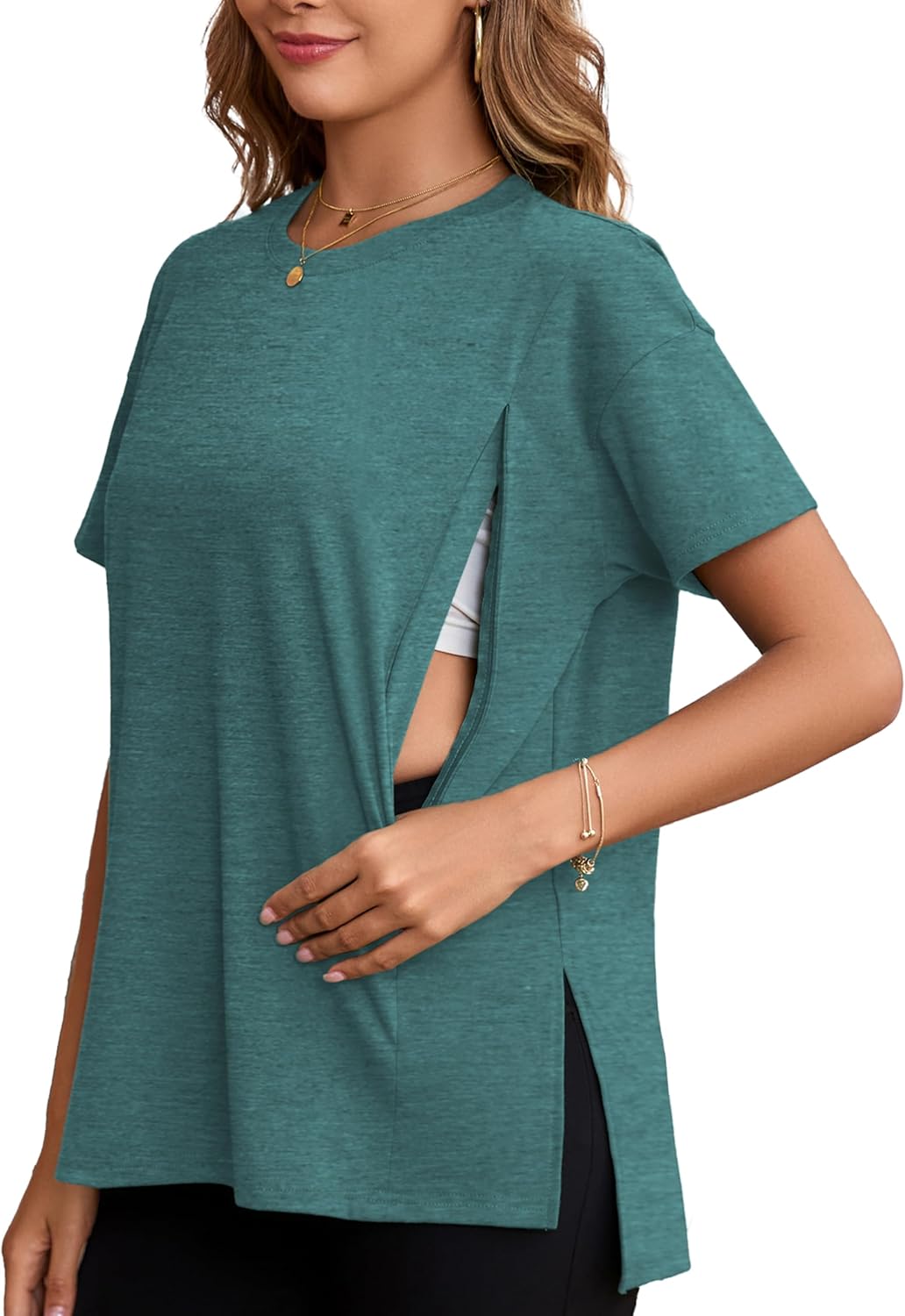 Ecavus Women's Oversized Nursing Shirts for Breastfeeding with Hidden Zipper Short Sleeves Side Splits Maternity Tops