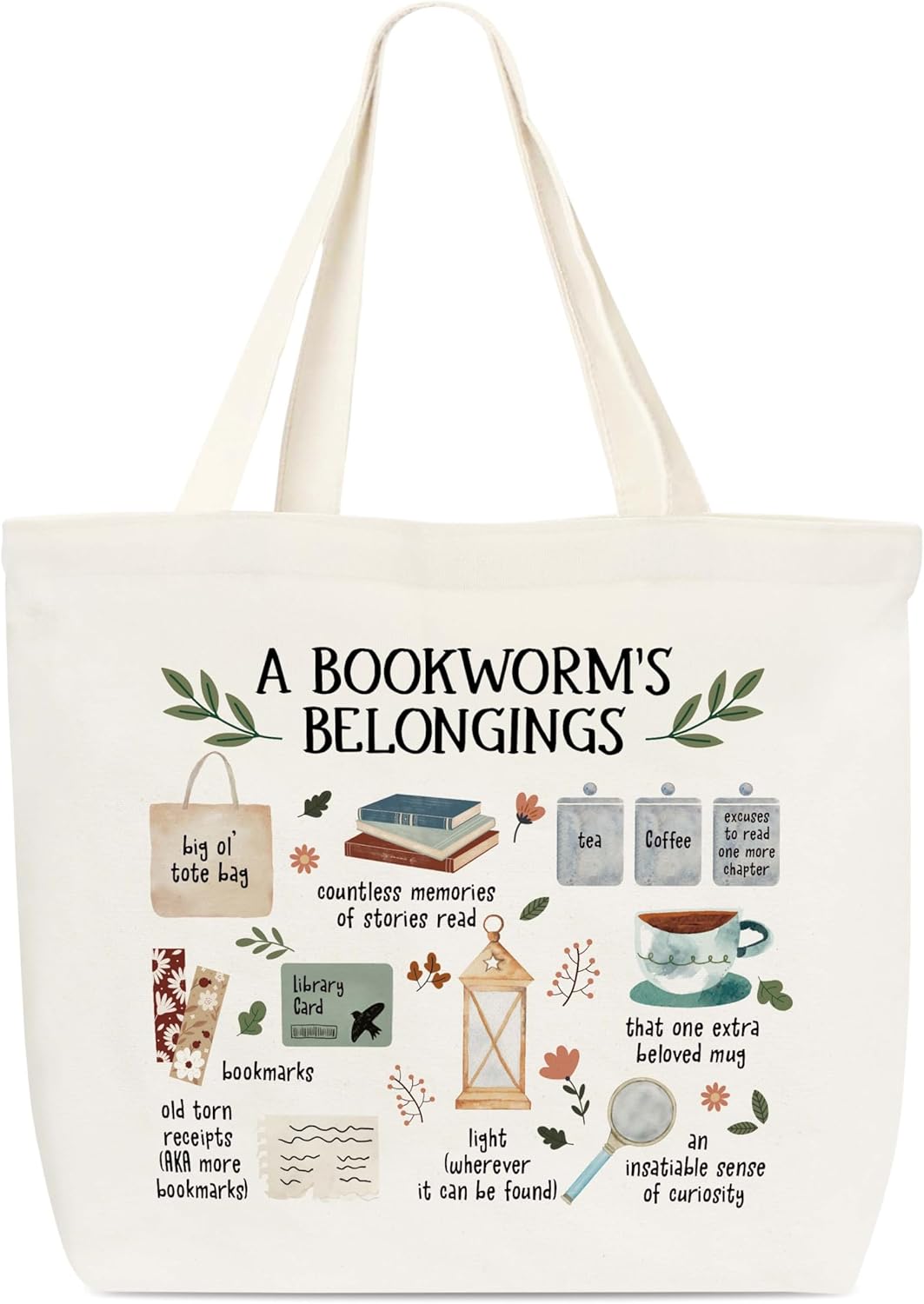 Canvas Tote Bag, Book Tote Bags, Book Lover Gift, A Bookworm's Belongings Tote, Library Tote Bag, Reusable Grocery Shopping Bag, Library Shoulder Bag For Reader Bookish Women Friend Bookworm A(12)