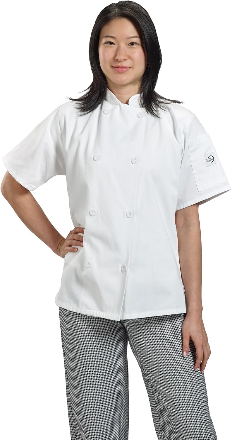 - PRACTICAL DESIGN: Designed with the working female chef in mind, this jacket contains a shoulder pocket, side slits for easy movement, and a traditional double-breasted design with fold back cuffs for easy, everyday work wear