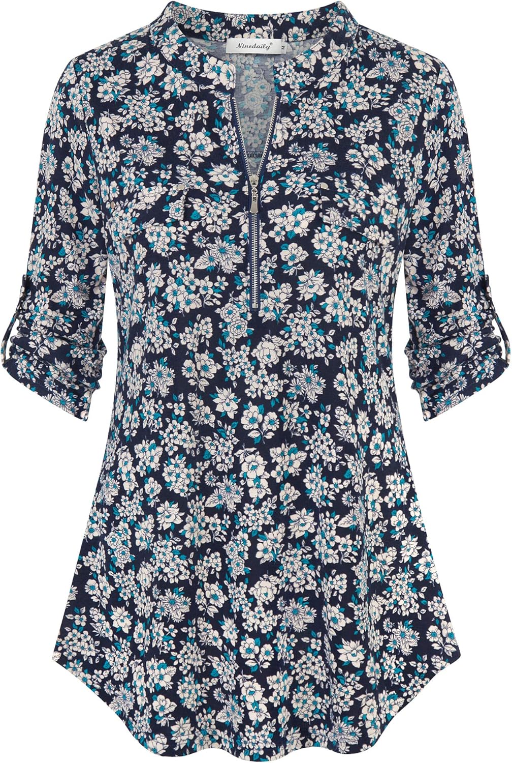 Ninedaily Women's 3/4 Sleeve Plaid Shirts Zip Floral Casual Tunic Blouse Tops