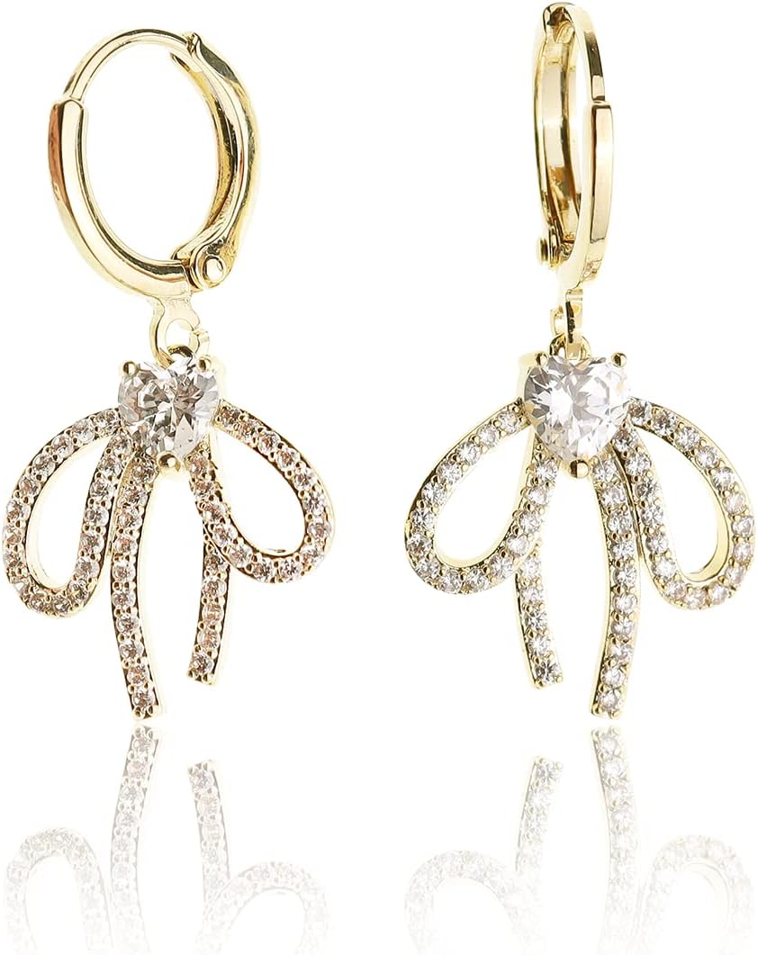 Sonateomber Gold Bow Dangle Small Hoop Earrings for Women, Cute Christmas Tree Sparkly CZ Rhinestone Snowflakes Ribbon Drop Earings Holiday Xmas Accessories Fashion Jewelry Gift