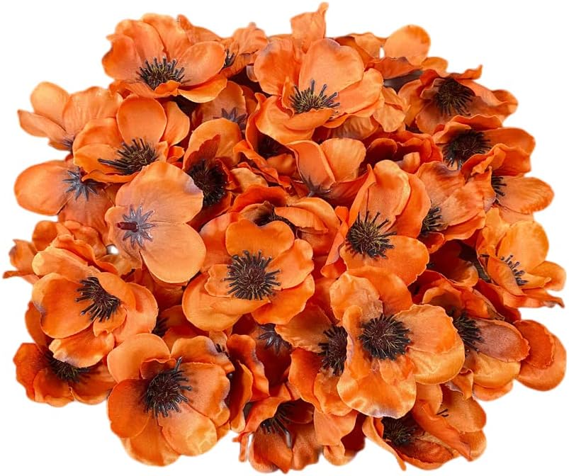 Rikyo 100 pcs Artificial Silk Poppy Anemone Flower Heads Autumn Fake Flower,Vase Fillers,Corsages for Wedding Decor,Nursery Wall,Archway Decor Wreath Garland Cake Ornaments,7cm Heads (Orange)