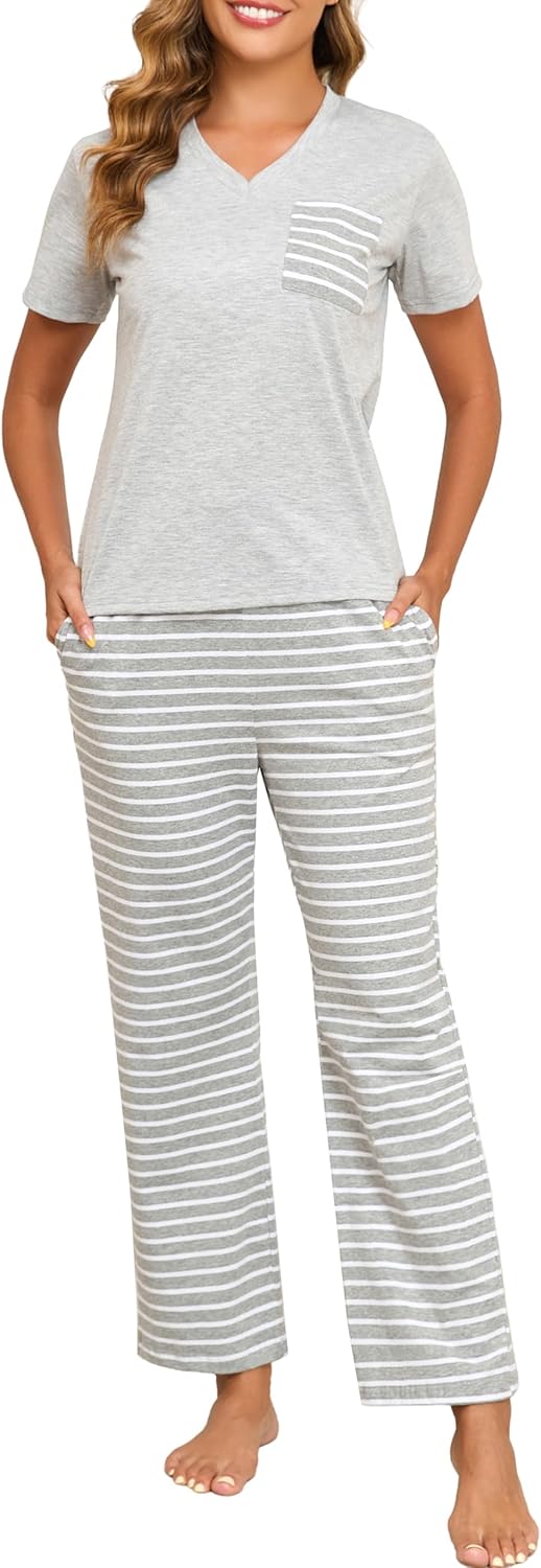 Donnalla Women's Pajama Sets Cotton 2 Piece Lounge Set V Neck Short Sleeve Pj Set Comfy Loungewear Sleepwear with Pocket