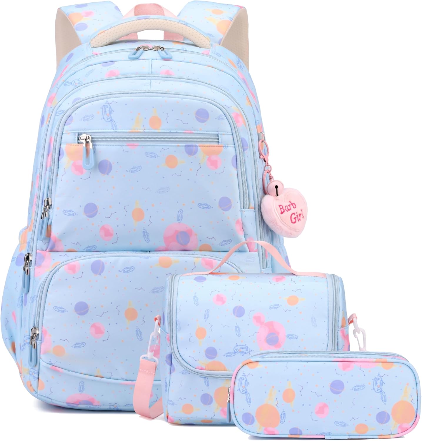 - Colorful Cute Girls Backpack Set; The backpack set includes a large-capacity shoulder backpack, a lunch bag that can be carried cross-body or handheld, and a multi-layer, sortable and organizable pen pouch, with a new design that optimizes the use of space and better