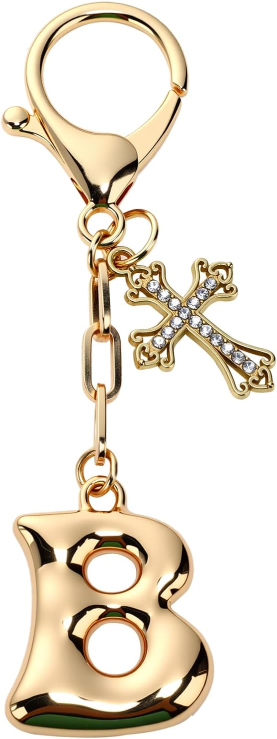 Bubble Initial Keychain with Cross - Gold Letter Bag Charms for Women, Cute Purse Charms & Handbag Accessories