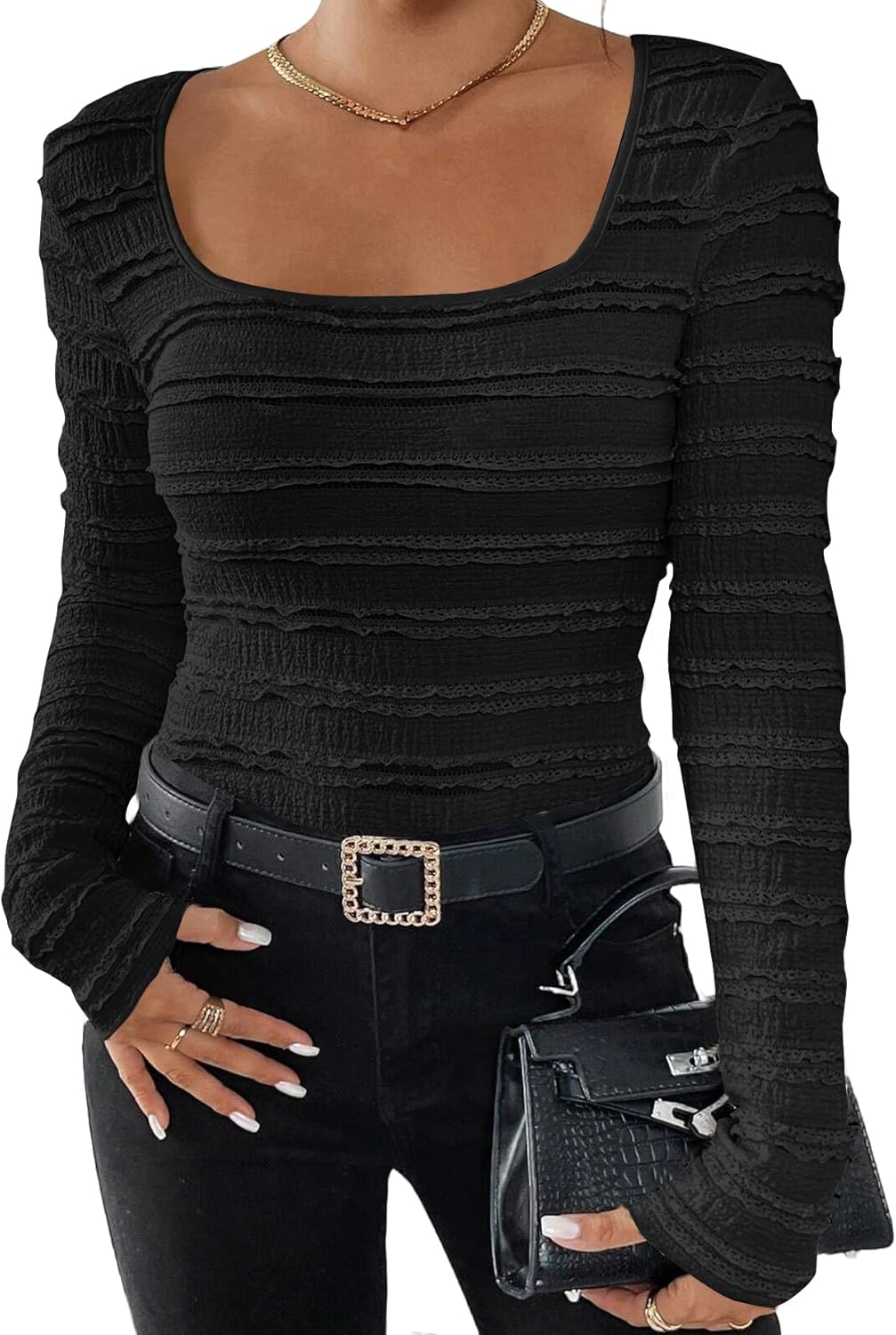 Women's Square Neck Mesh Long Sleeve Blouse Shirt Top