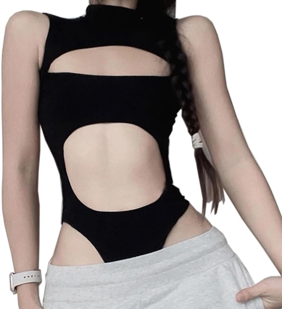 SINROYEE Women's Bodysuit Tops Sexy Hollow Out Summer Streetwear Outfit Gothic Jumpsuit T Shirt Short Sleeve Sleeveless