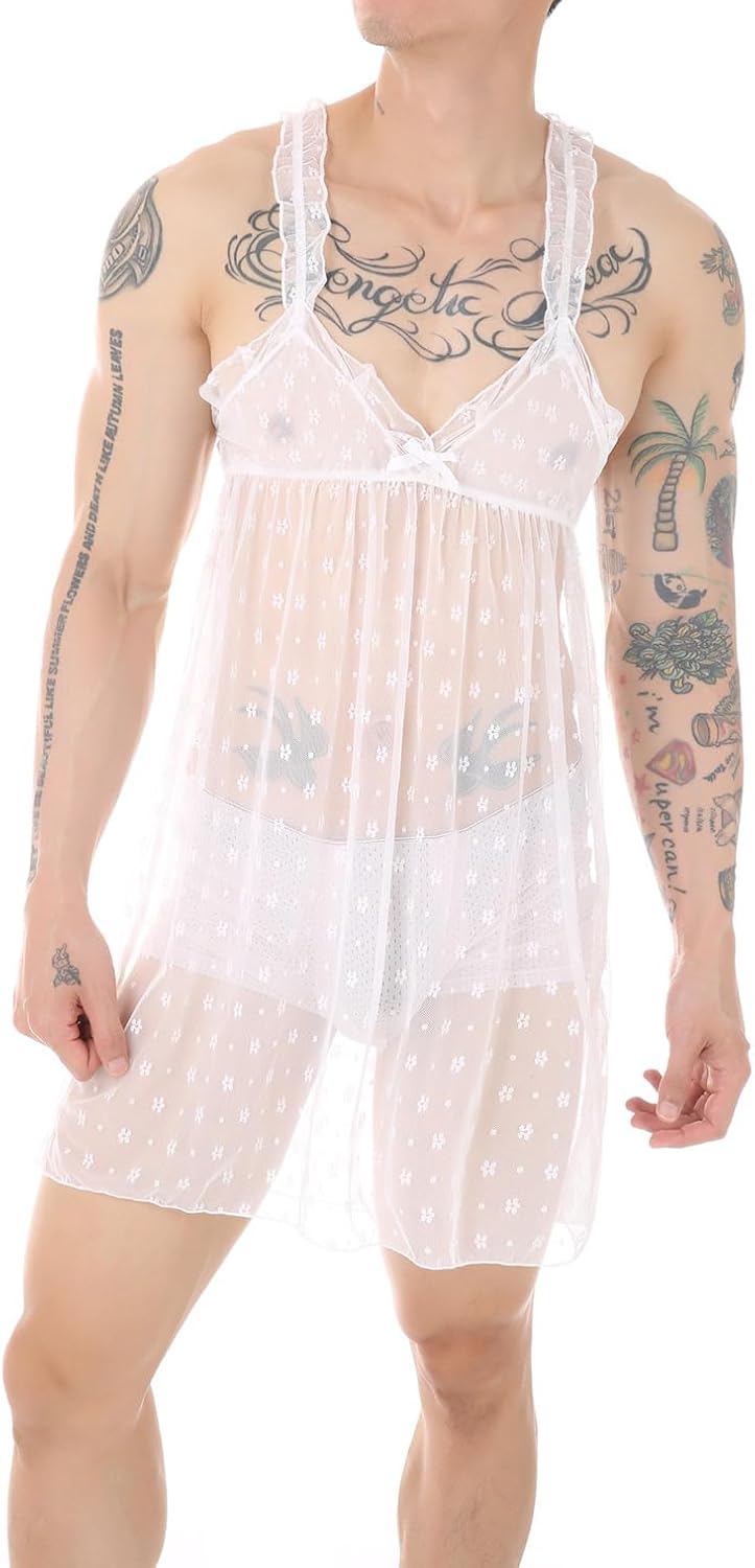 Mens Sissy Lingerie Crossdressing Nightwear Sheer Lace Mesh Nightdress Ruffle Nightgown