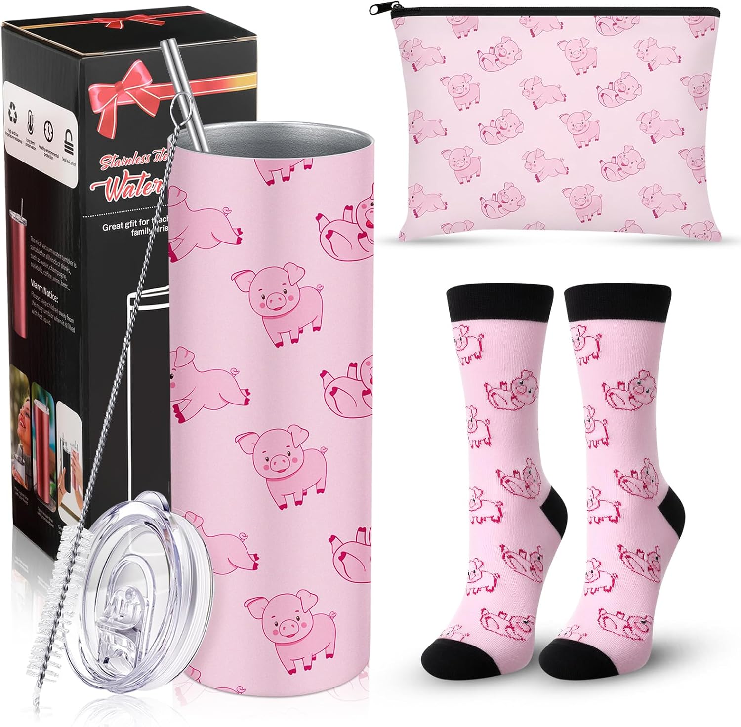 Yahenda 3 Pcs Pig Lover Gifts for Girls Women, 20 oz Insulated Stainless Steel Pig Travel Tumbler Mug with Straw Brush Novelty Animal Socks Makeup Bag, Christmas Gifts for Animal Friends