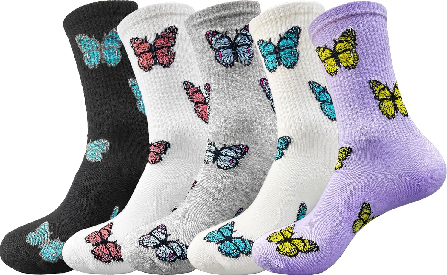 Butterfly Embroidered Crew Socks Cute Animal Embroidery Quartz Socks Funny Dress Socks for Women, Lady, Girls, 5 Pack
