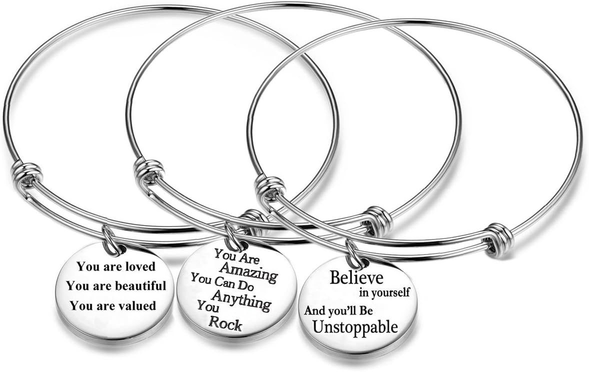 Jvvsci 3PCS Stainless Steel Inspirational Charm Bracelets Jewelry Set Engraved Message Motivational Expendable Bangles for Women Girls