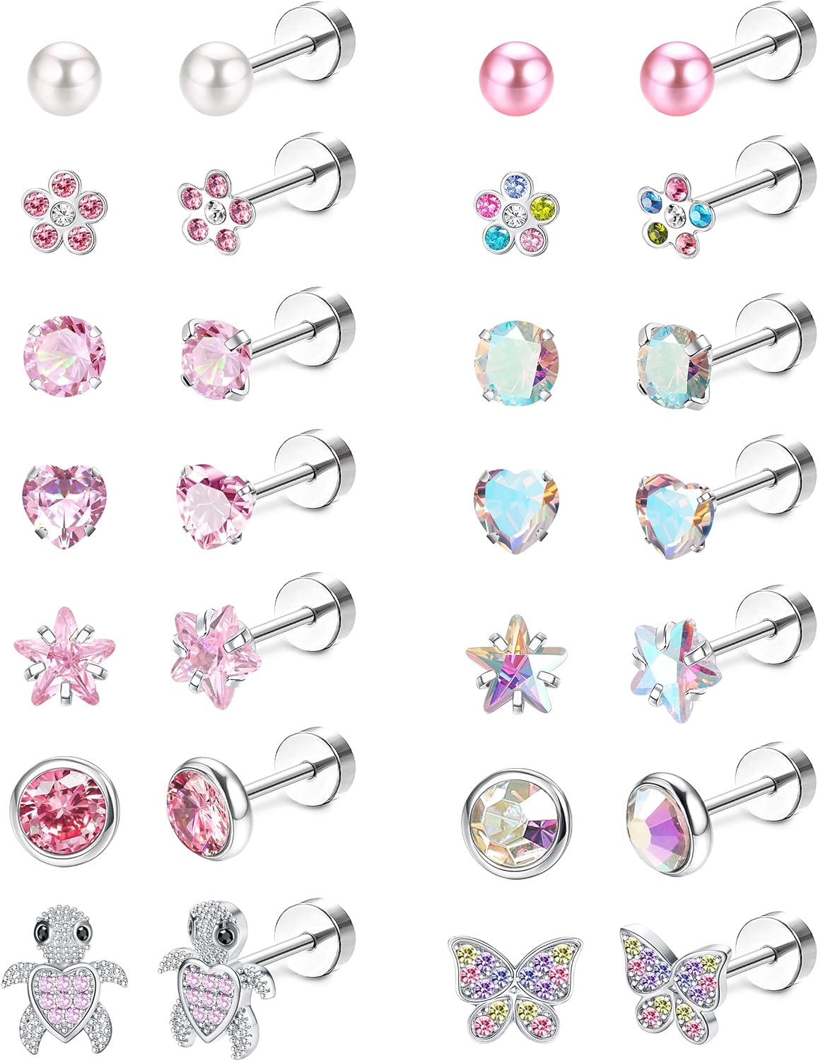 LOYALLOOK 14Pairs Hypoallergenic Screwback Earrings for Women Girls Tiny CZ Pearl Ball Heart Flower Screw Back Earring Studs 316L Stainless Steel Stud Earrings Flatback 20G Over 3 Years Old