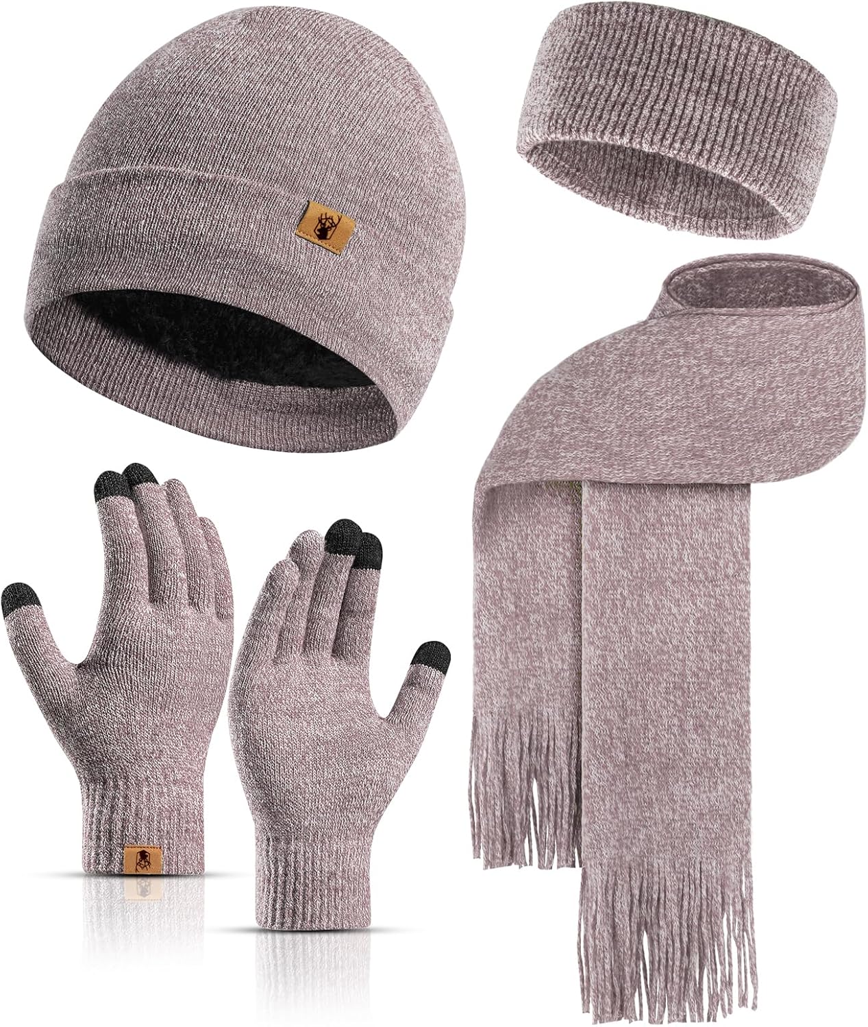 Winter Warm Beanie Hat Touchscreen Gloves Long Scarf Set for Women with Headband, Knit Cap Scarves with Tassel for Women