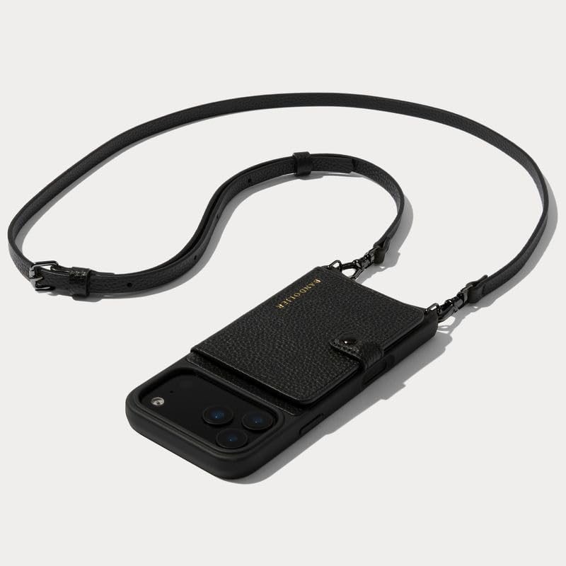 Bandolier Mila Crossbody Wallet Phone Case [MagSafe Compatible] for iPhone 17 Pro Max. 100% Genuine Pebble Leather. Adjustable & Removable Strap. Black with Pewter Hardware