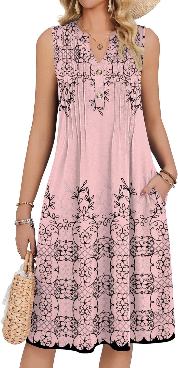 Zeagoo Women Summer Casual Dress 2026 Sleeveless Midi Tank Sundress with Pockets V Neck Buttons Pleated A Line Tshirt Dress