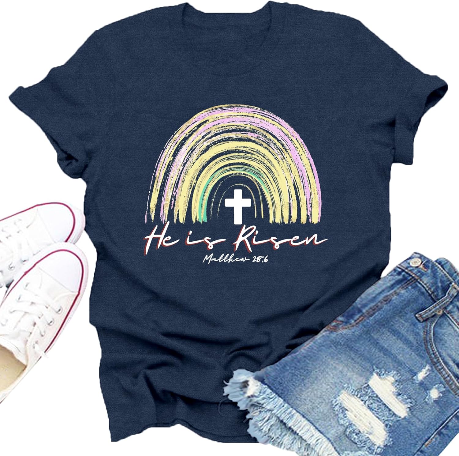 Christian Shirts for Women He is Risen T-Shirt Cross Rainbow Jesus Faith Tee Tops