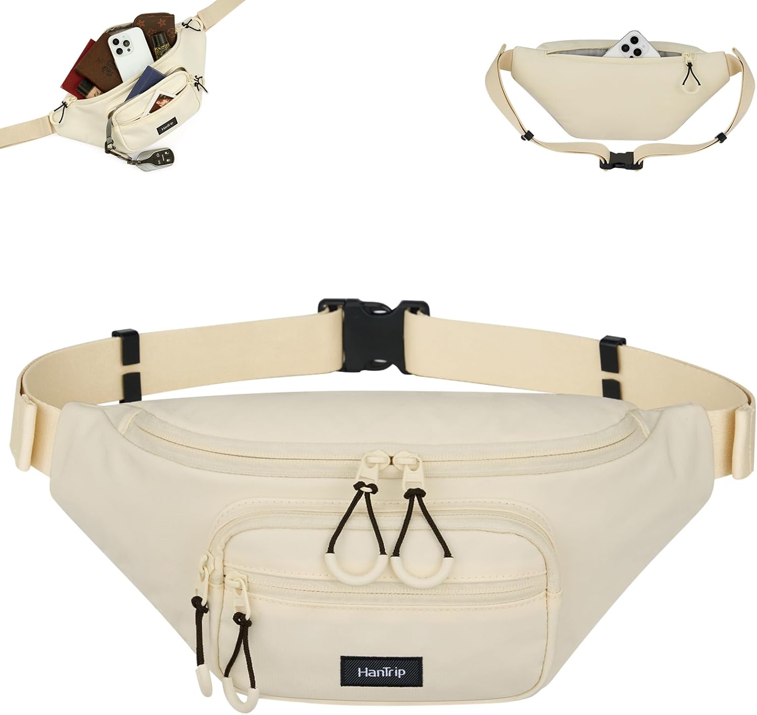 Fanny Packs for Women Men, Large Travel Fanny Pack Lightweight Crossbody Waist Bag Large Capacity, Water Resistant Belt Bags with Adjustable Strap for Hiking, Cycling (Offwhite)