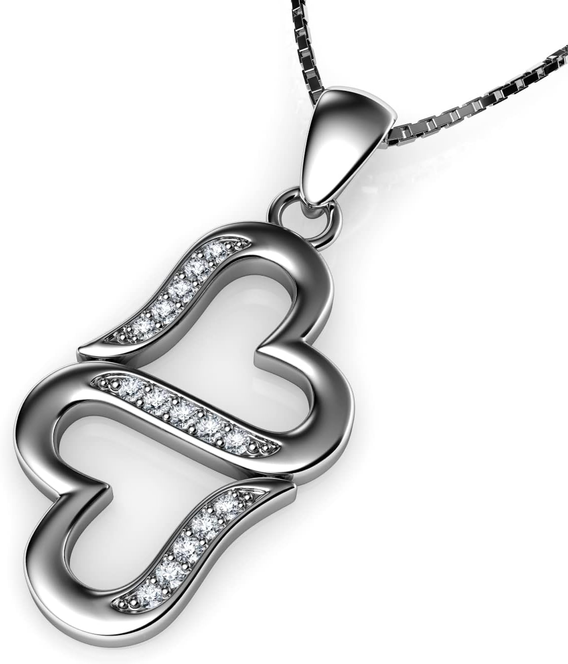 DEPHINI - Two hearts Necklace - Cubic zirconia Jewelry - Double heart 925 Sterling Silver pendant - Rhodium Plated