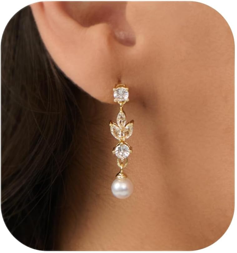 Pearl Earrings: 14k Gold/White Gold/Rose Gold Plated Cubic Zirconia Accented Pearl Drop Dangle Wedding Engagement Earrings For Women Bridal Bridesmaid
