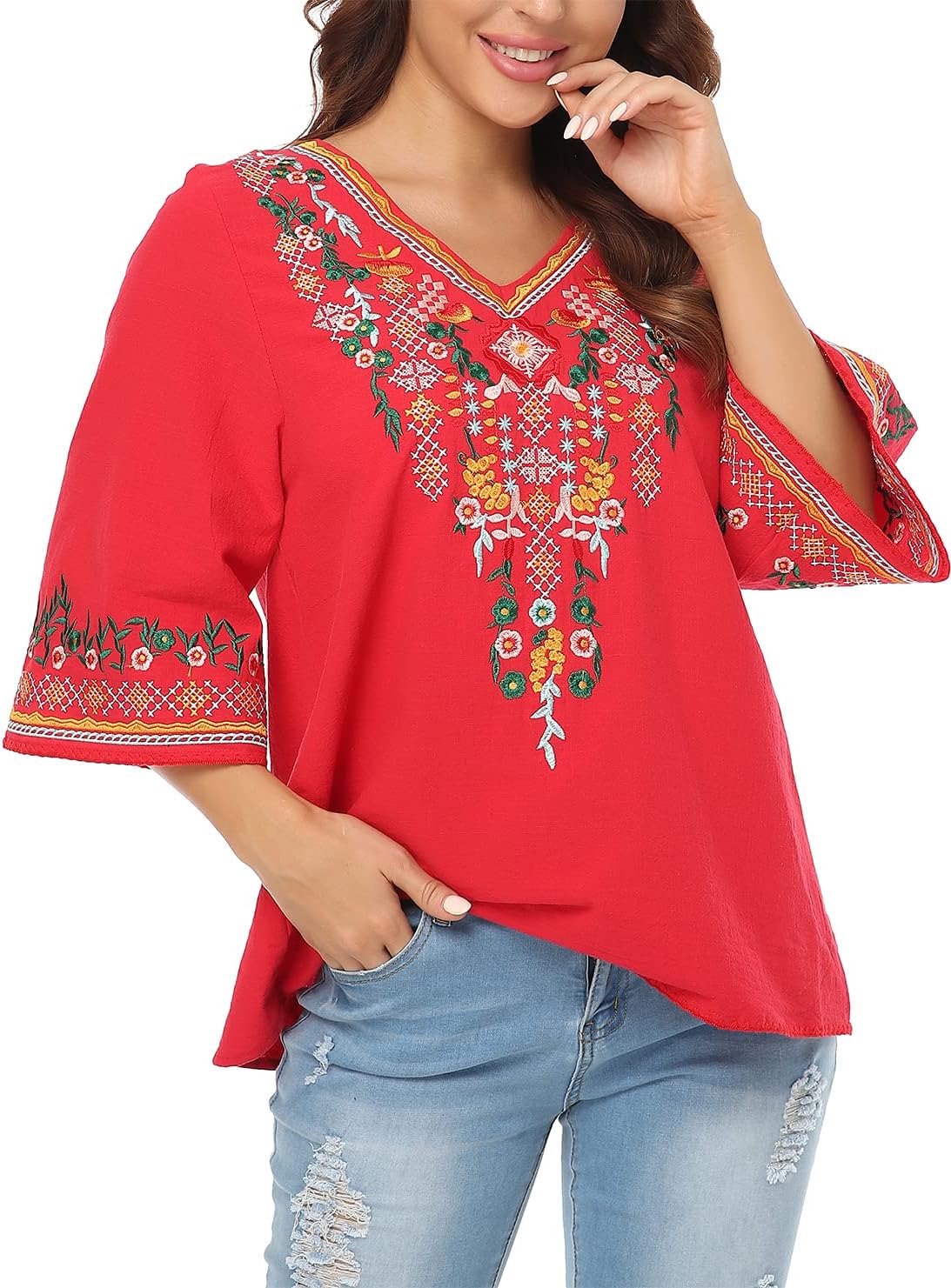 YZXDORWJ Women's V Neck Embroidered Mexican Peasant Blouse